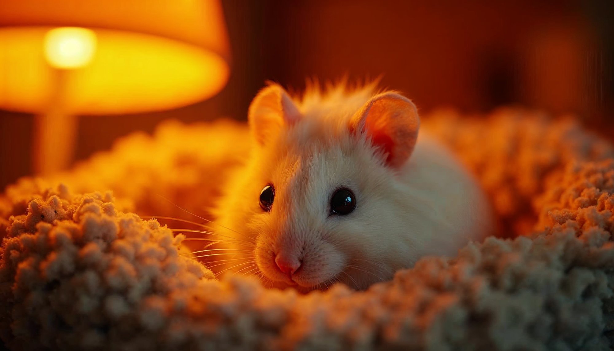 A white hamster is comfortably nestled in a soft bed, illuminated by warm light from a nearby lamp during the evening.