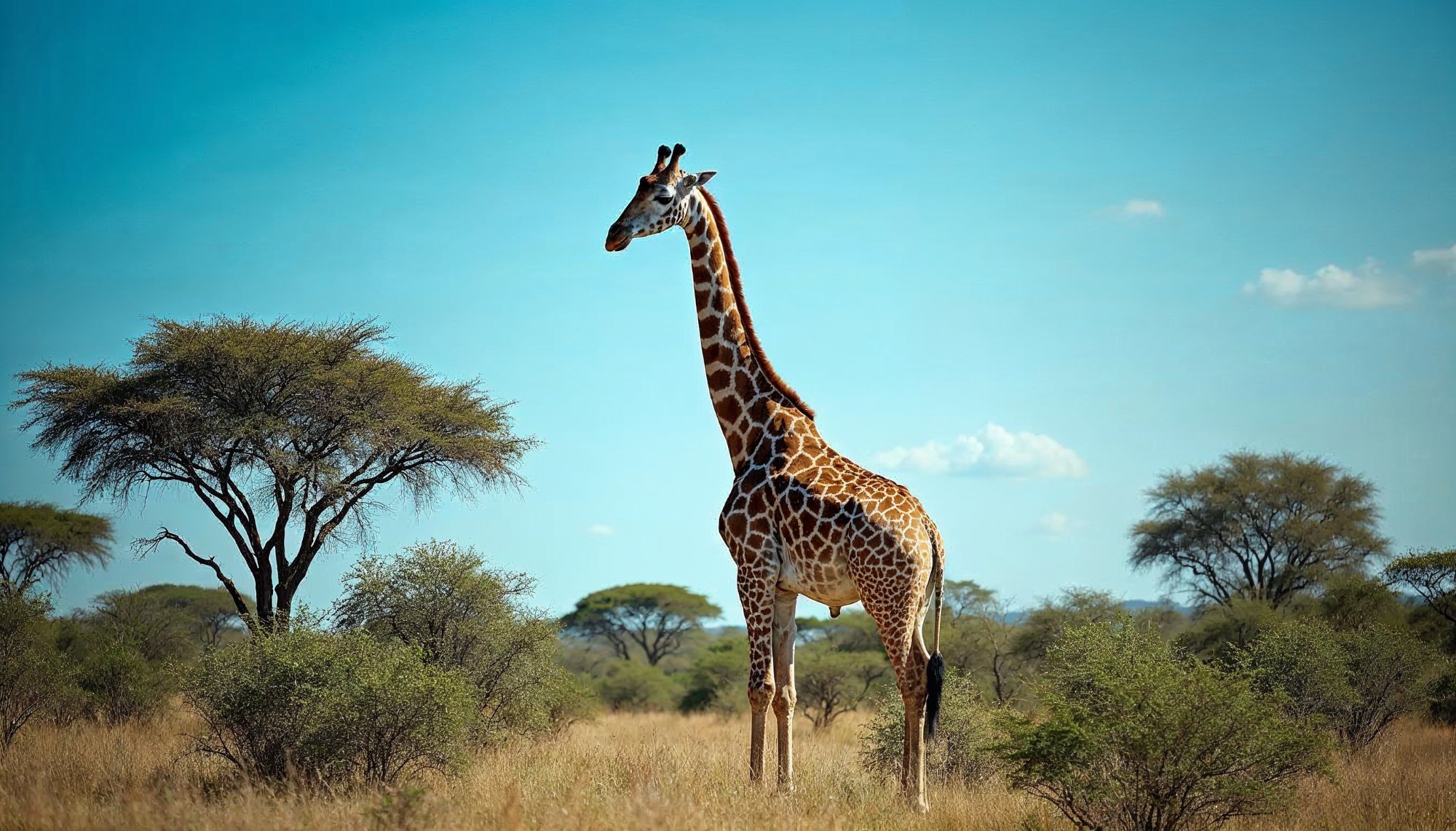 A tall giraffe stands gracefully in the savannah, surrounded by sparse trees and golden grass, under a vibrant blue sky.