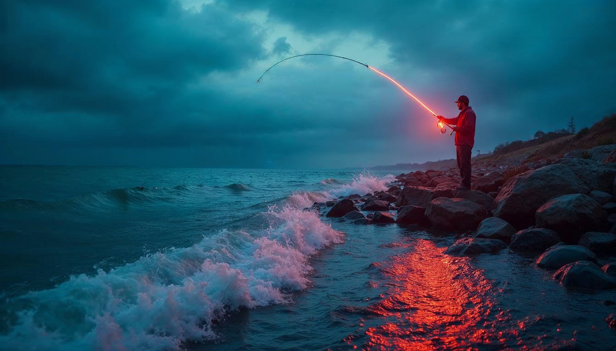 A person casts a fishing line from rocky terrain as waves crash nearby at dusk. The sky is overcast, creating a dramatic atmosphere.