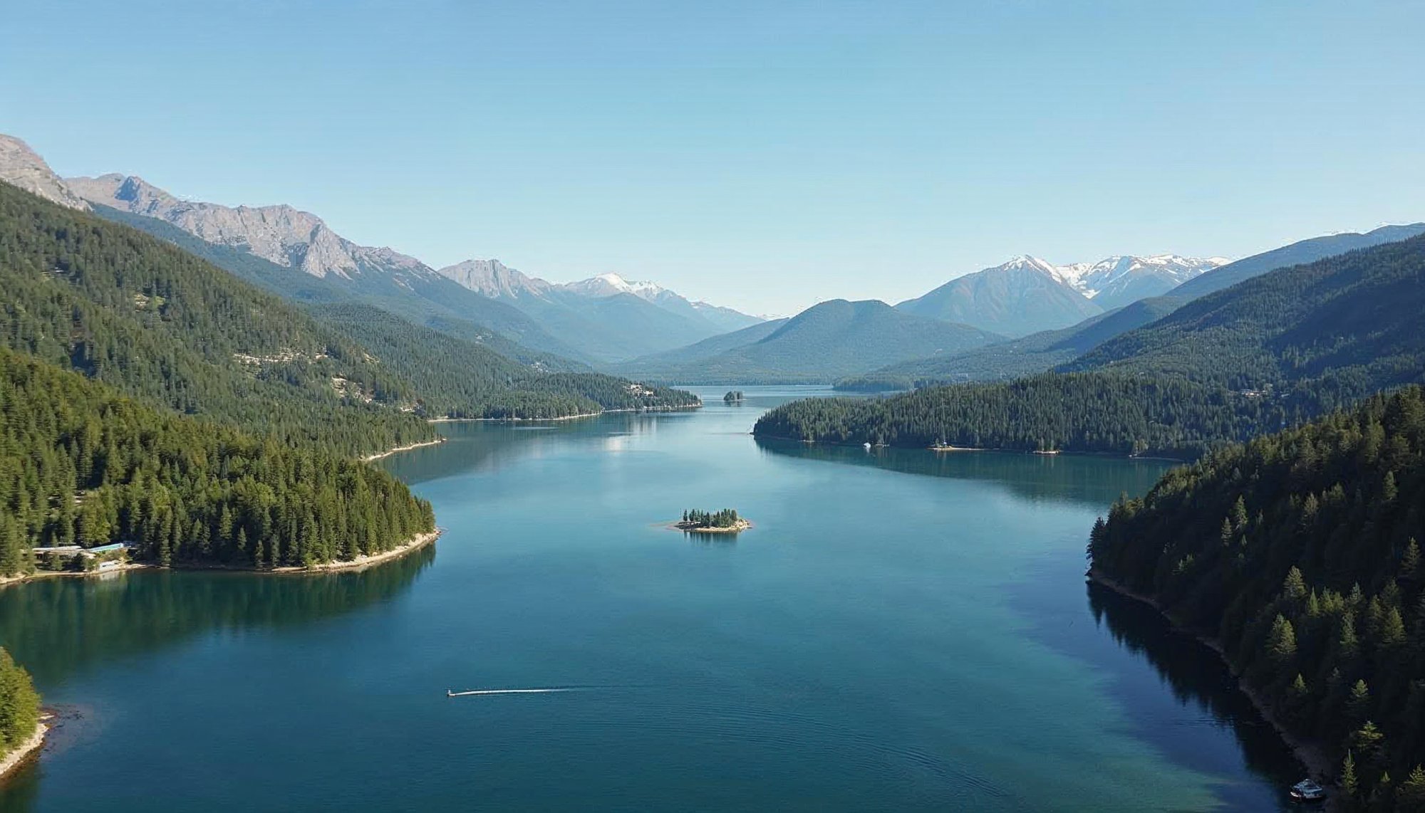 This stunning landscape features a tranquil lake with a small island, framed by majestic mountains under a clear blue sky.