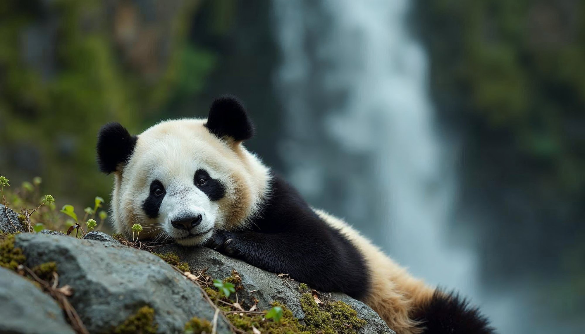 A panda lies comfortably on a rock, surrounded by greenery, with a serene waterfall in the background, creating a peaceful atmosphere.