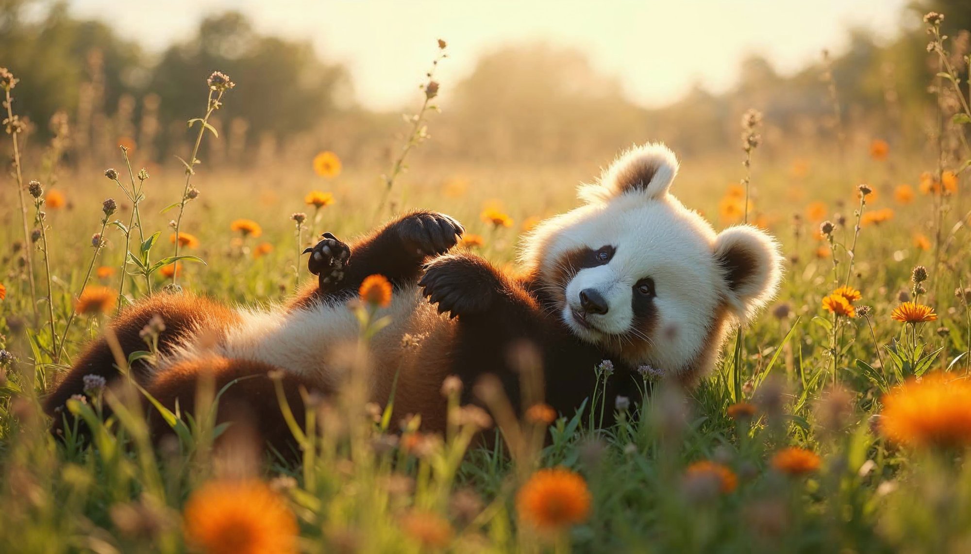 A young panda lies in a field of colorful flowers, basking in the warm glow of the setting sun and enjoying a playful moment in nature.
