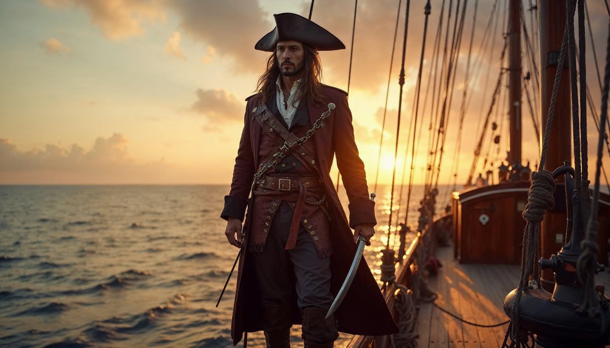 A pirate captain stands confidently on the deck of a ship as the sun sets, casting a golden glow across the ocean waves.