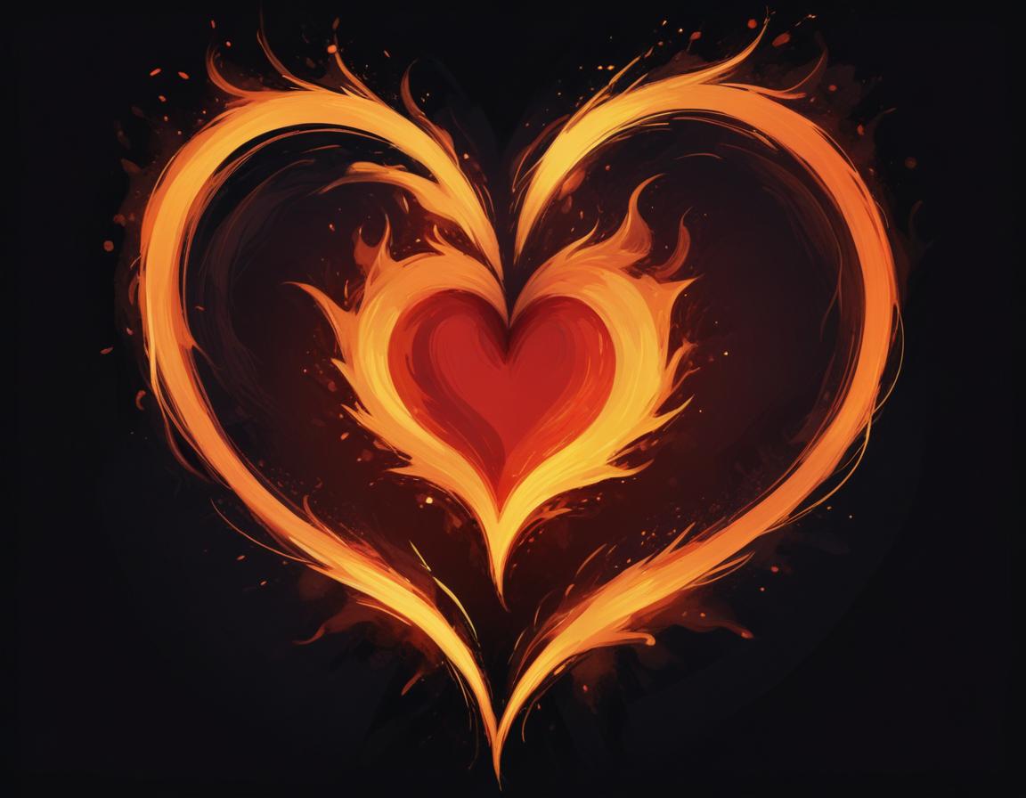 A vivid heart design features flames in shades of orange and red against a black background, creating a striking and passionate symbol.