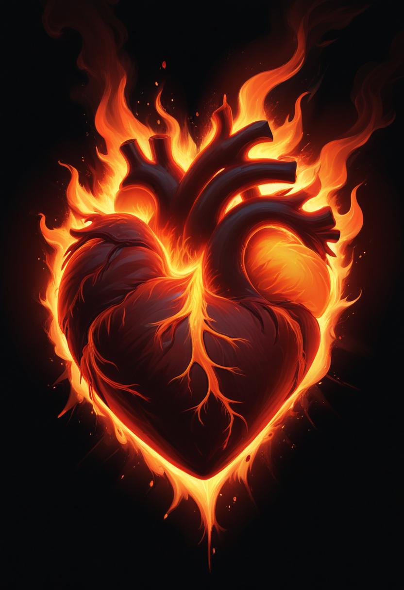 A heart surrounded by intense flames, illustrating power and passion amidst a dark background, creating a striking visual contrast.