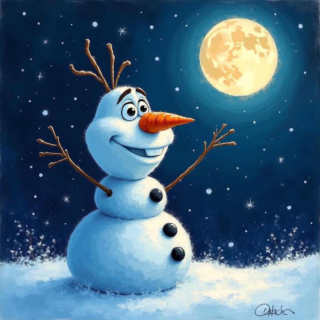 animation, cartoon, celebration, character, cheerful, childlike, cold, festive, fun, happiness, joyful, landscape, moonlight, nature, night, outdoor, snow, snowman, whimsical, winter