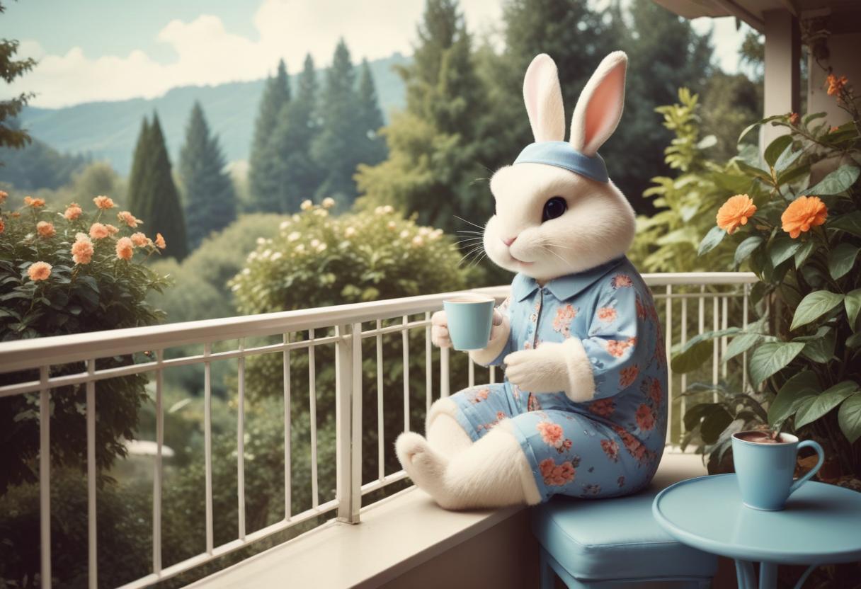 A large bunny dressed in a blue floral outfit relaxes on a balcony, sipping coffee while surrounded by greenery and flowers.