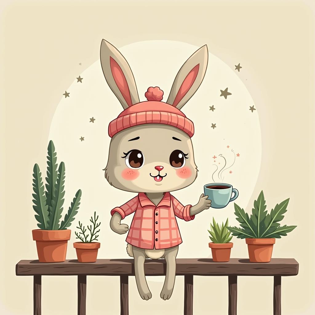 A cheerful bunny in a cozy outfit sits on a shelf, sipping a hot drink while surrounded by various potted plants, creating a warm atmosphere.