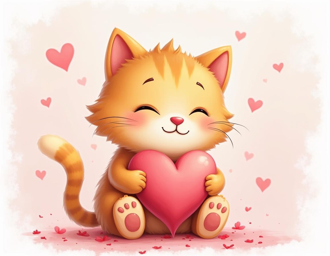 A cheerful orange kitten sits with a large pink heart, surrounded by floating heart shapes, radiating joy and affection in a playful atmosphere.