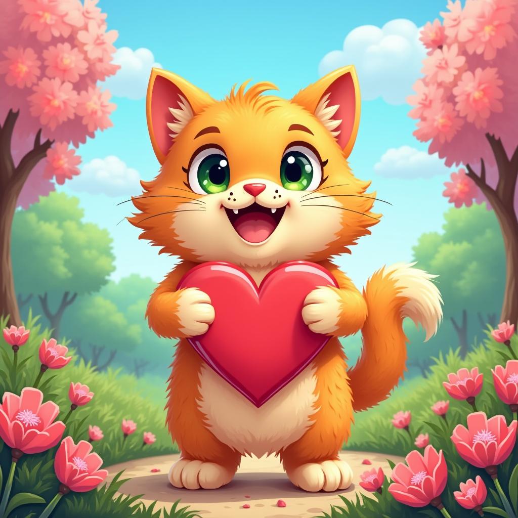 A cheerful orange cat stands in a vibrant garden, holding a red heart, surrounded by blooming flowers and lush greenery.
