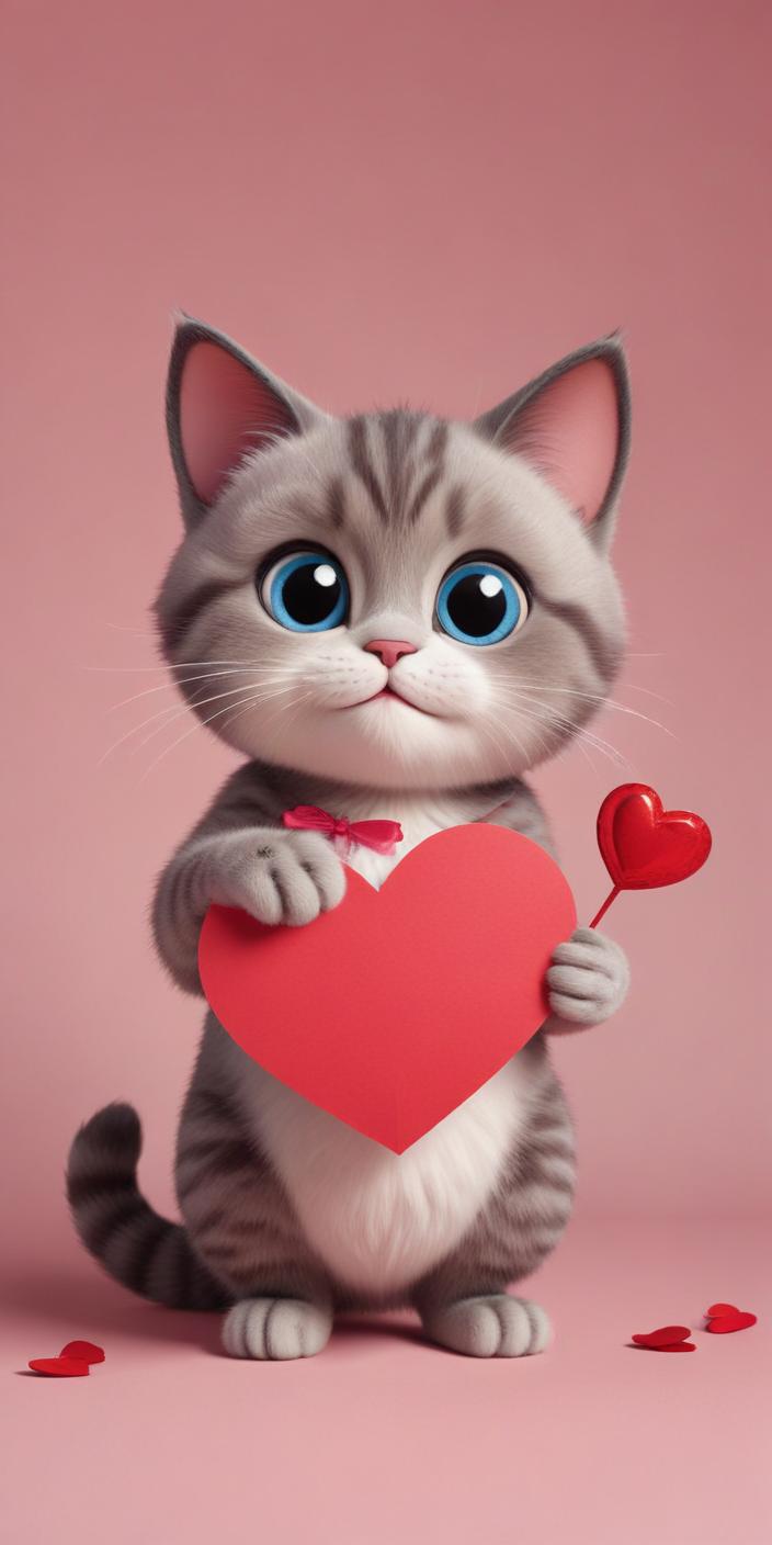 A playful cat with large blue eyes holds a red heart while standing against a soft pink backdrop, perfect for a cheerful occasion.