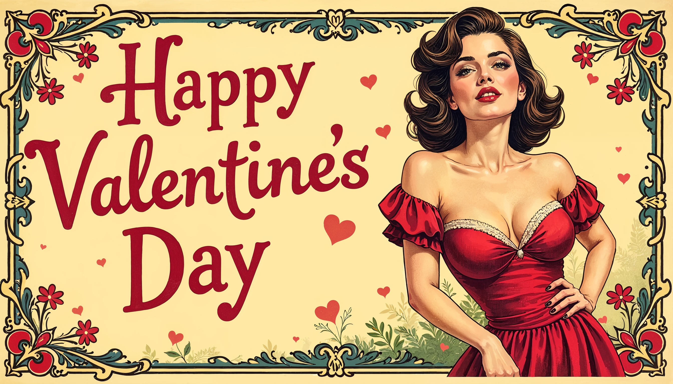 A retro Valentine's Day card displays a woman in a red dress, surrounded by hearts, conveying a festive and romantic mood.