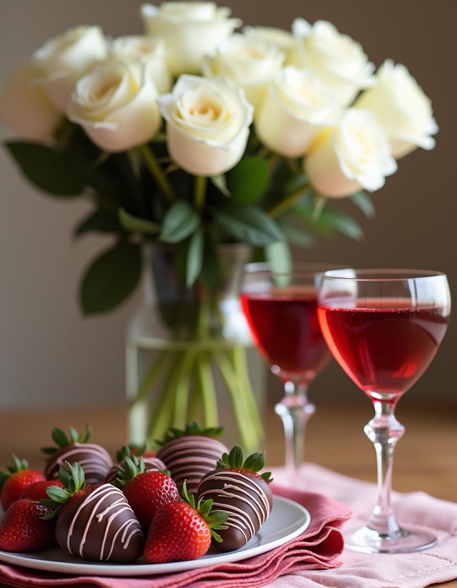 Two elegant glasses filled with red beverage accompany a platter of chocolate covered strawberries, with white roses in the background.