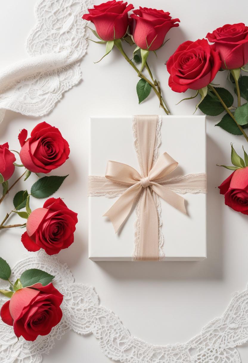 A beautifully wrapped gift box is placed at the center, surrounded by vibrant red roses and delicate lace, creating an enchanting display.