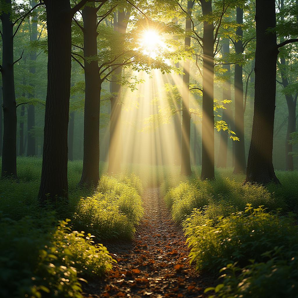 Soft sunlight filters through the trees, illuminating a tranquil path surrounded by lush greenery during early morning hours.