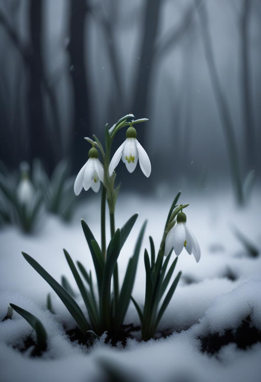 Delicate snowdrops emerge from a blanket of snow in a serene forest during winter, surrounded by misty trees and ethereal light.