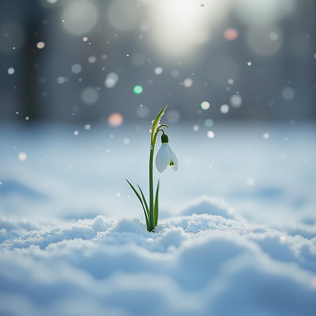 A delicate snowdrop flower stands alone in a snowy landscape, glistening under soft sunlight amidst falling snowflakes.