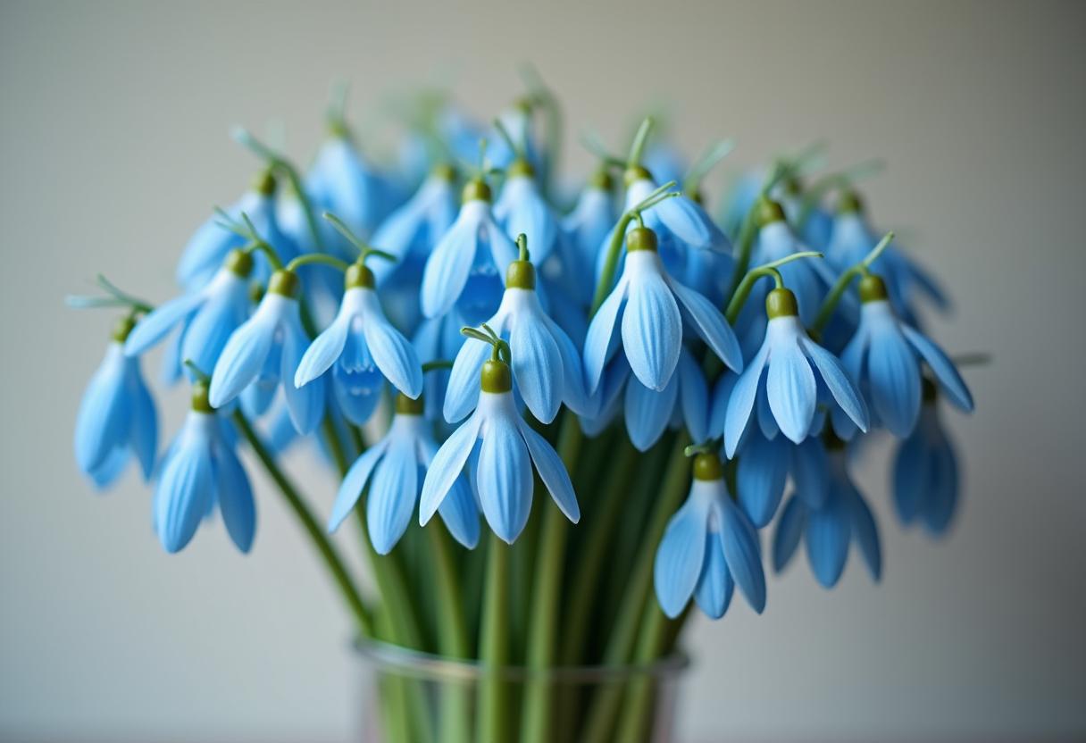 A bouquet of delicate blue snowdrop flowers rests in a clear vase, showcasing their unique bell-shaped blooms and vibrant colors.
