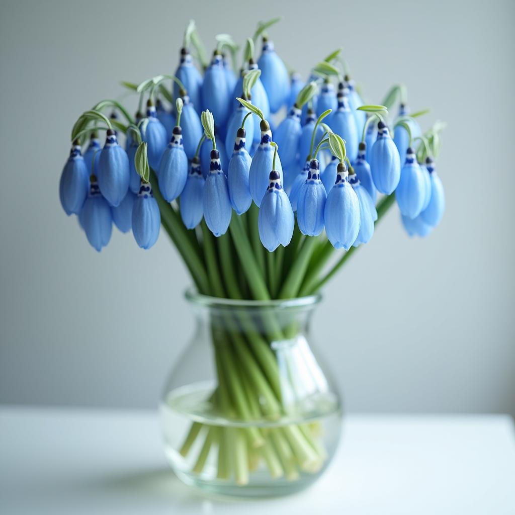 blue flowers, bouquet, decoration, delicate petals, floral arrangement, fresh flowers, glass vase, green stems, home decor, indoor gardening, indoor plants, light background, natural beauty, nature, serene, simplicity, soothing, spring blooms, still life, table decor