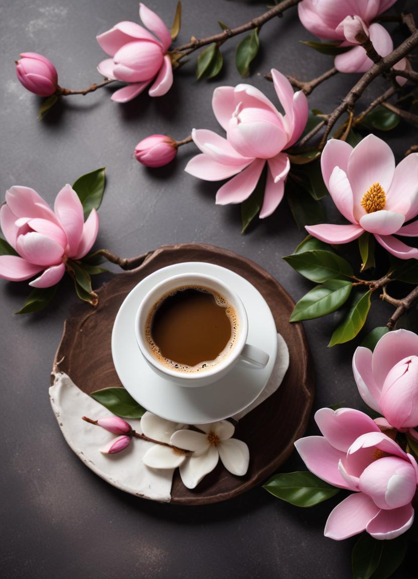 aesthetic, beverage, blossom, coffee, comfort, cup, dark plate, elegance, floral arrangement, flowers, freshness, garden, home decor, leisure, magnolia, morning, nature, relaxing, spring, tea