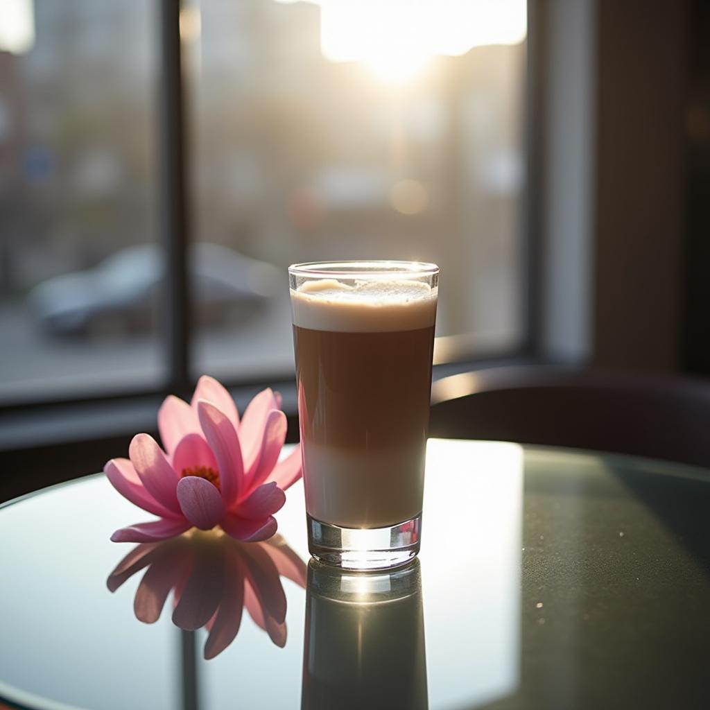 A glass of frothy coffee sits on a table near a window, with a pink flower nearby, as warm sunlight fills the room during sunset.