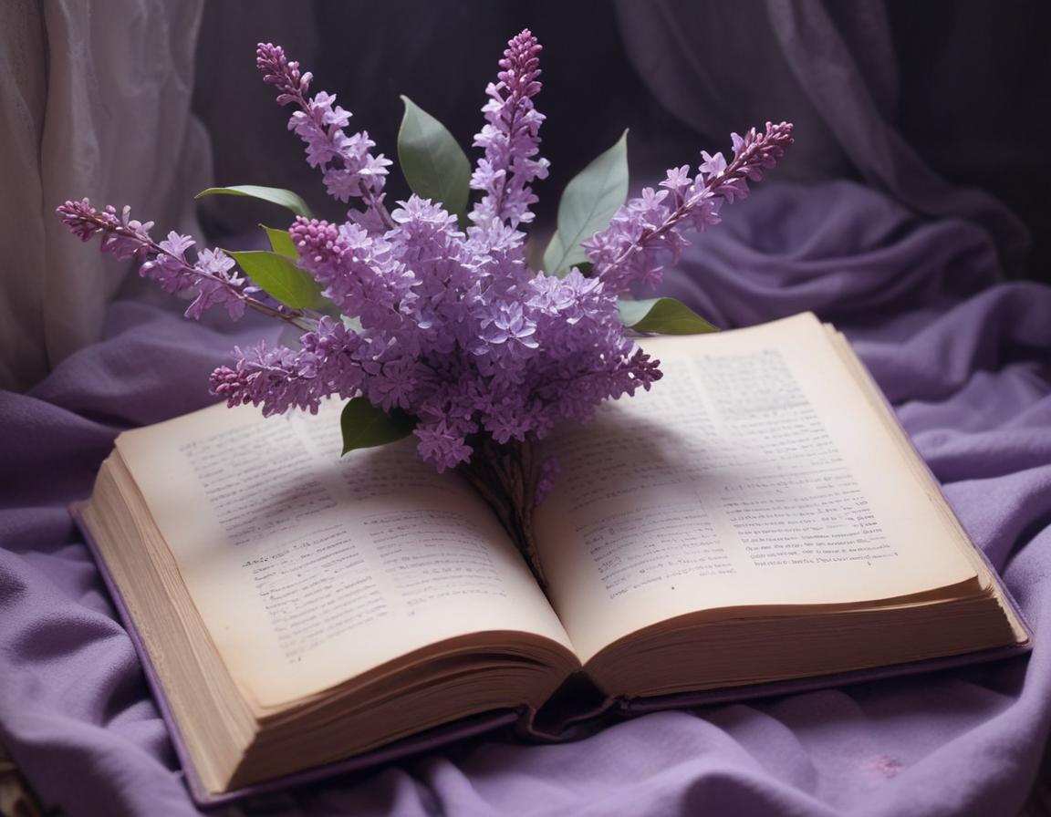 Purple flowers burst from an open book resting on soft fabric. The serene composition creates a tranquil atmosphere perfect for reading.