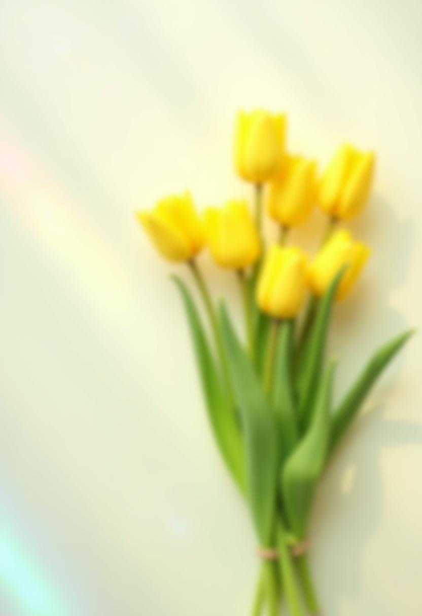 A bouquet of vibrant yellow tulips leans against a soft, neutral backdrop, giving a warm and cheerful feeling to the setting.