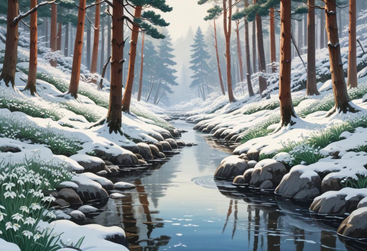 Tranquil setting of a snow-covered forest with tall trees beside a gently flowing stream, capturing the calmness of winter.