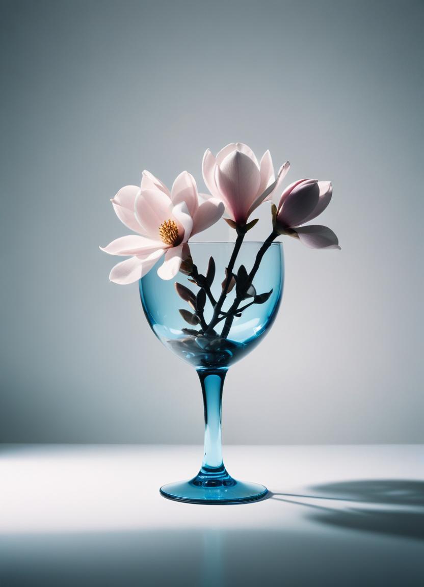 A blue glass vase holds pink magnolia flowers, casting soft shadows on the surface below. The elegant arrangement highlights the beauty of nature.
