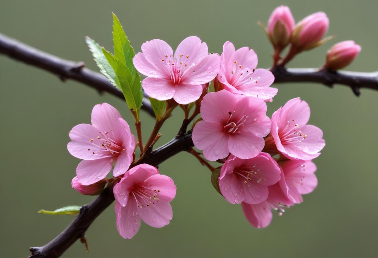Delicate pink cherry blossoms are in full bloom on a branch, showcasing their vibrant colors against a soft green background.
