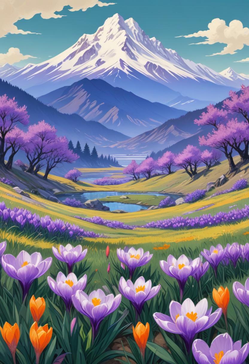 Vibrant crocuses bloom in a valley beneath a majestic snow-capped mountain. Cherry blossom trees line the serene river, showcasing spring's beauty.