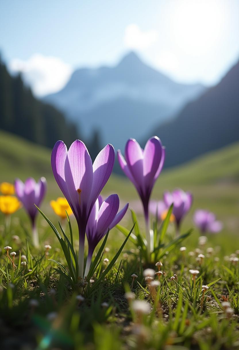 Crocuses display their bright purple petals against a backdrop of majestic mountains in a sunlit meadow during springtime.