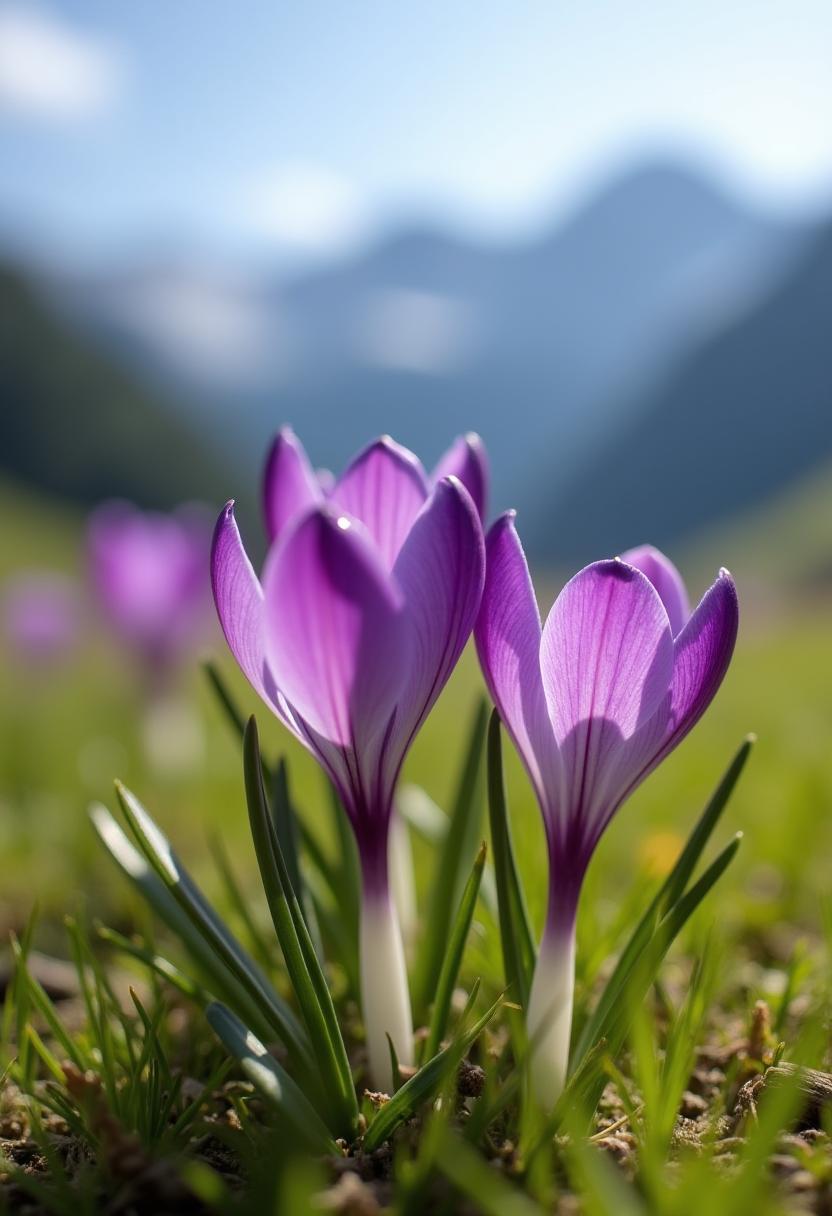 Crocuses with vibrant purple petals grow in a grassy field under bright sunlight, with majestic mountains visible in the background.