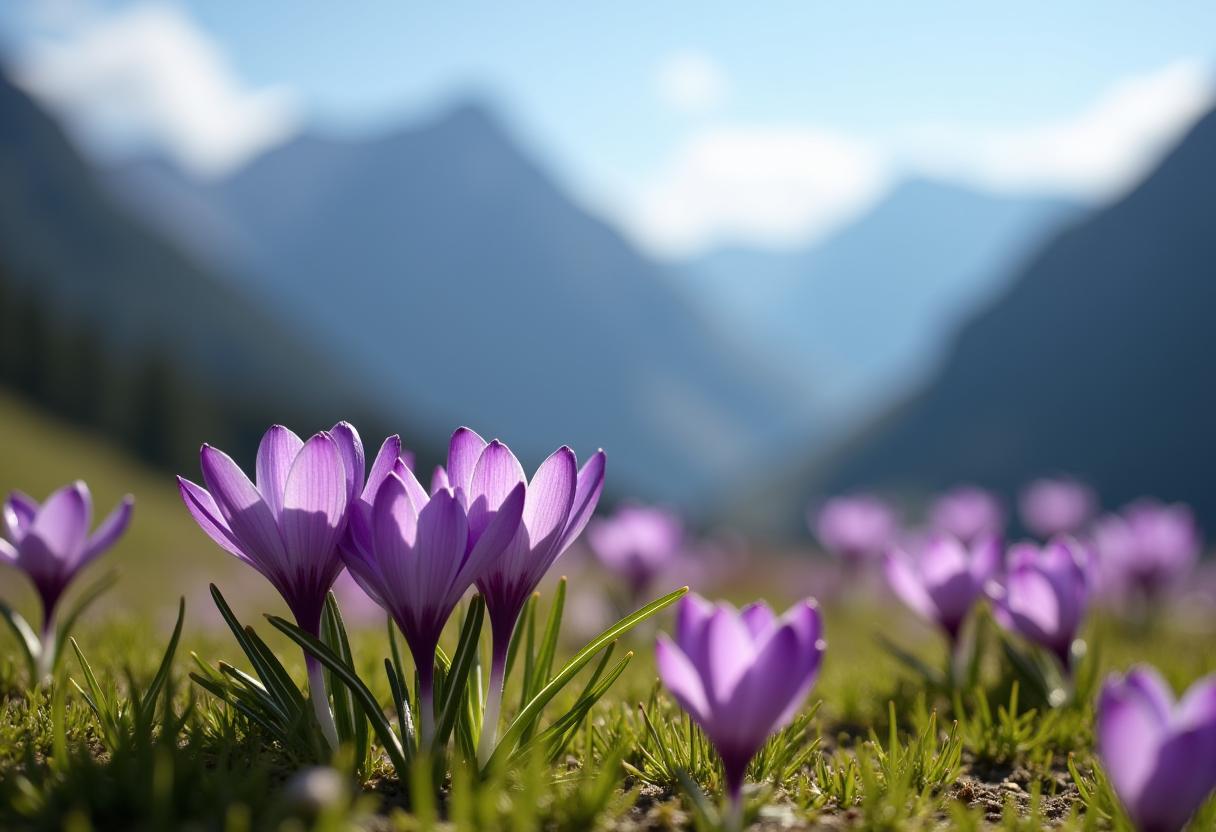 Vibrant purple crocuses bloom in a lush meadow surrounded by majestic mountains on a bright spring day, showcasing nature's beauty.