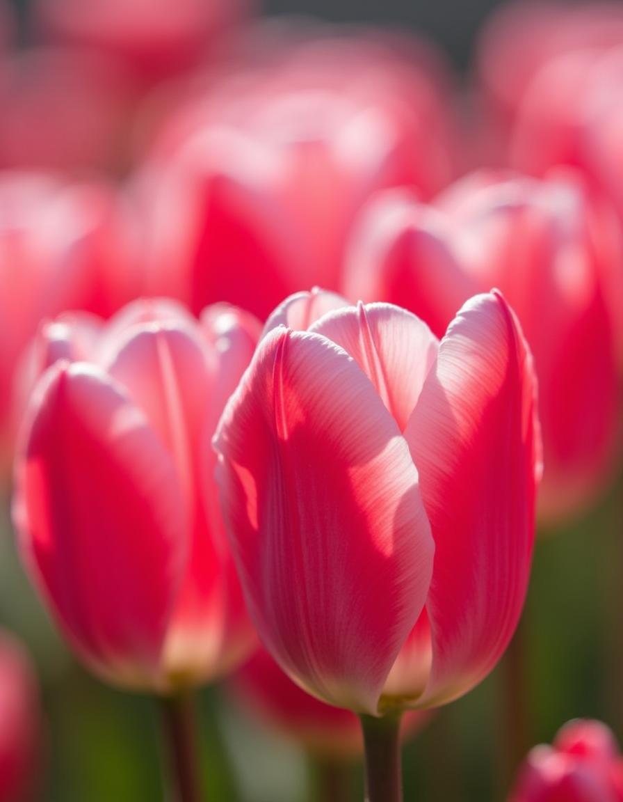 Vibrant pink tulips bloom under gentle sunlight in spring