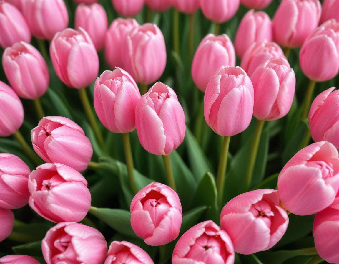 A cluster of elegant pink tulips flourishes in a lively spring garden, showcasing their delicate petals and lush green leaves.