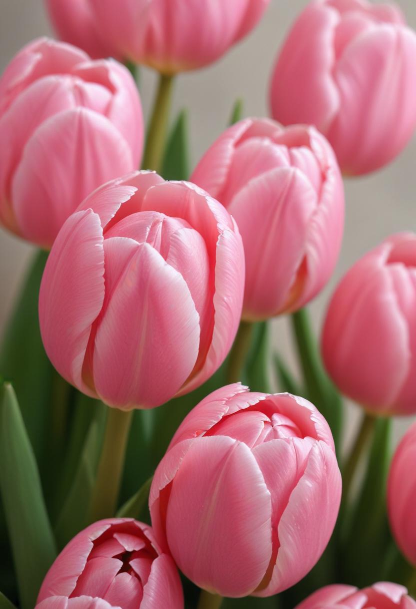 Fresh pink tulips stand tall in a vibrant arrangement, showcasing their delicate petals during the spring season, adding charm to any decor.