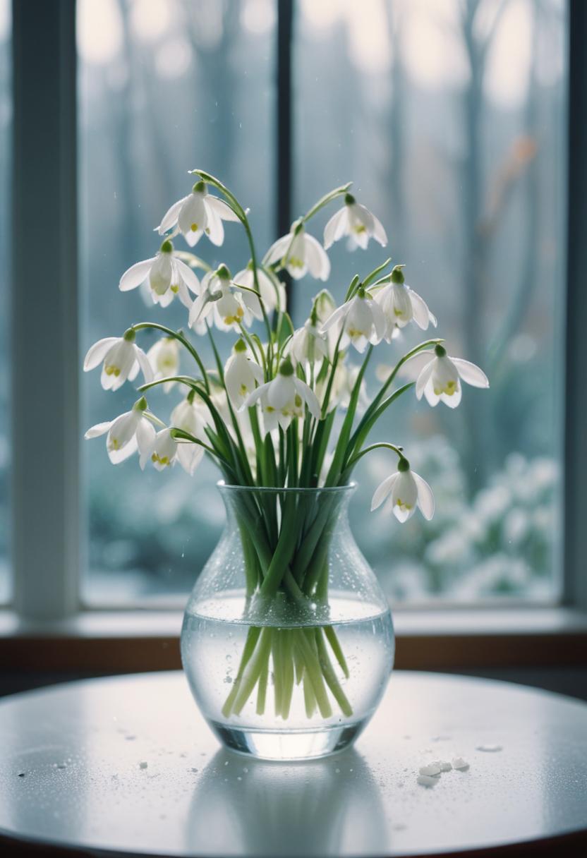 A beautiful bouquet of snowdrop flowers fills a glass vase on a table, creating a warm and inviting atmosphere during winter.