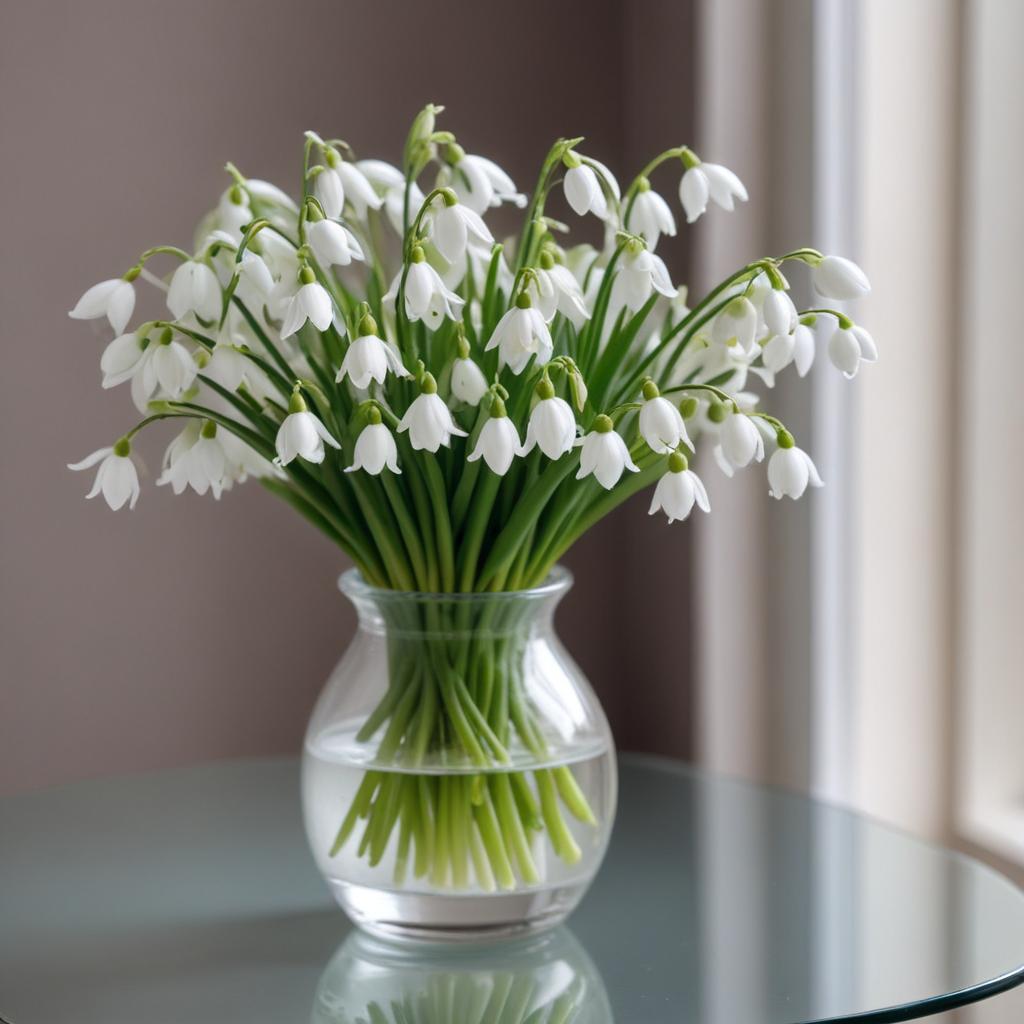 A vibrant snowdrop bouquet fills a clear vase, resting gently on a reflective table in a softly lit room, showcasing delicate blooms.