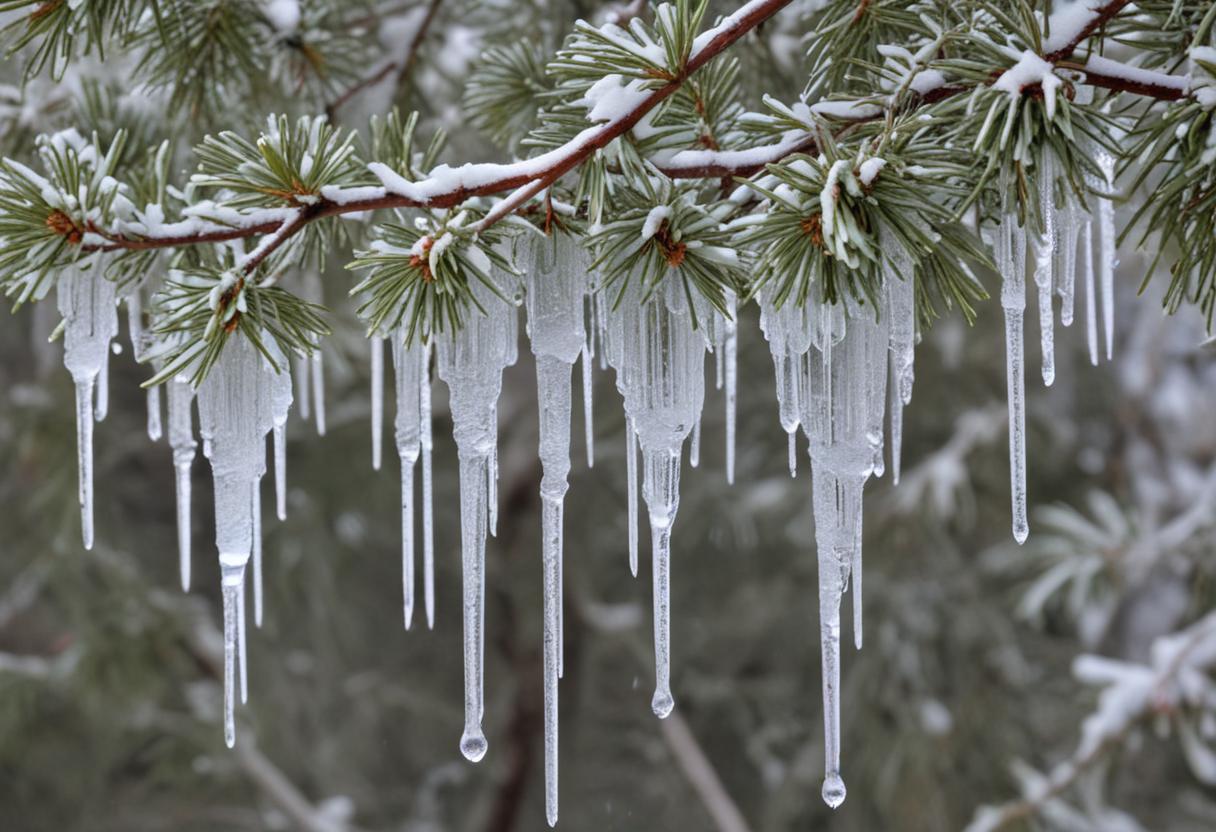 Icicles formed on pine tree branches create a stunning winter display, capturing the essence of the cold season in a serene natural setting.