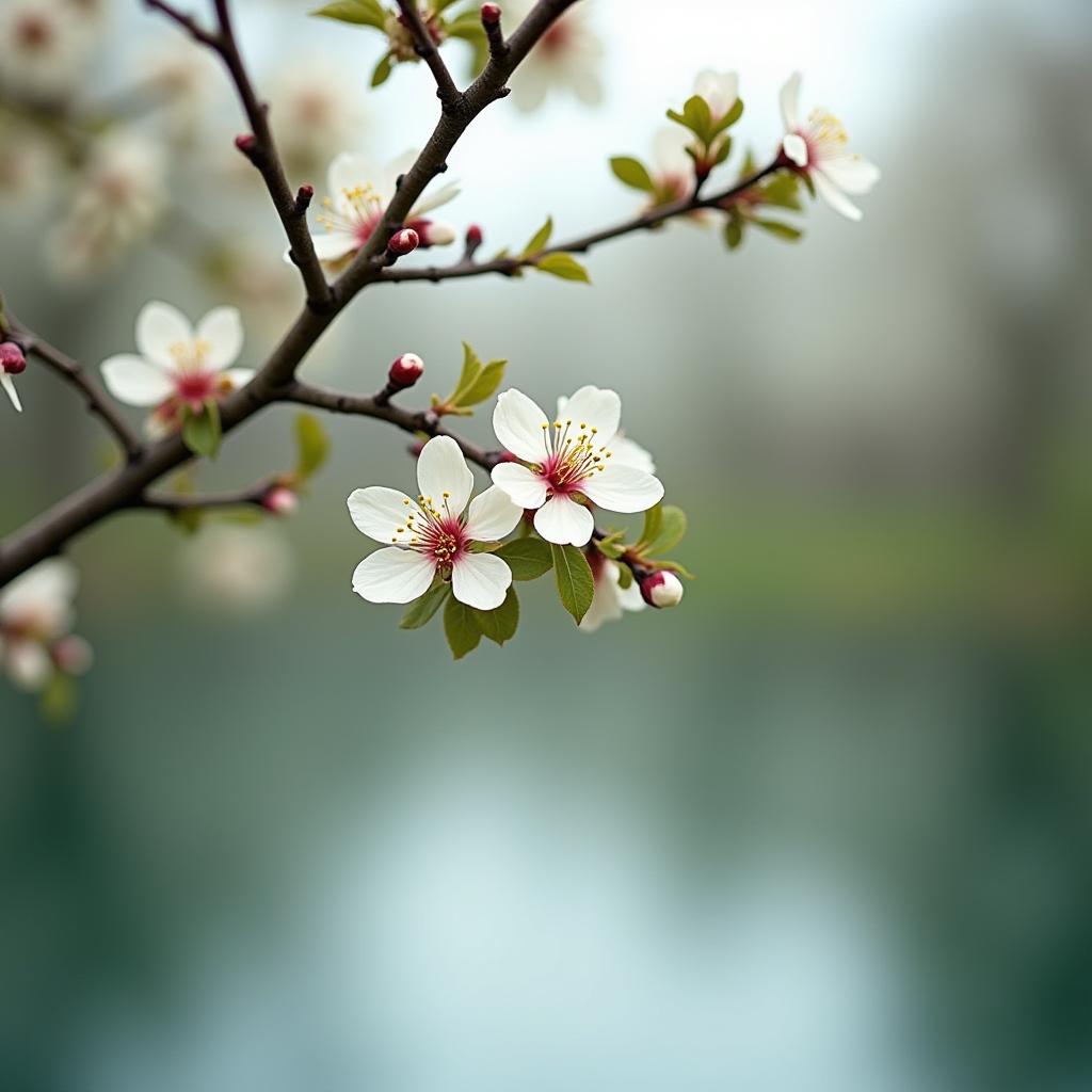 A branch with delicate white cherry blossoms displays vibrant colors along a calm body of water, inviting a peaceful atmosphere.