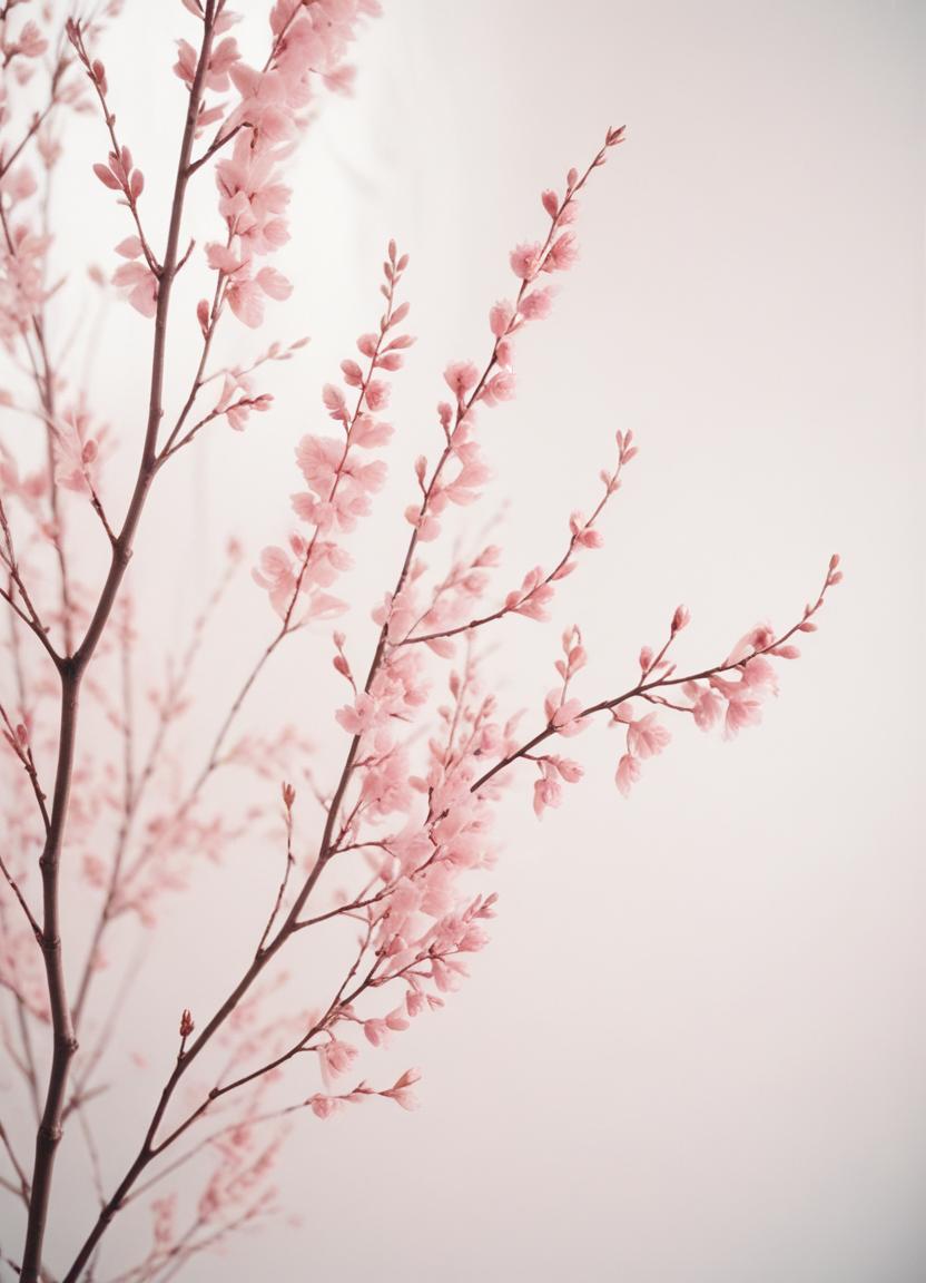 Soft pink blossoms branch out elegantly against a gentle background, creating a serene and calm atmosphere in the interior space.