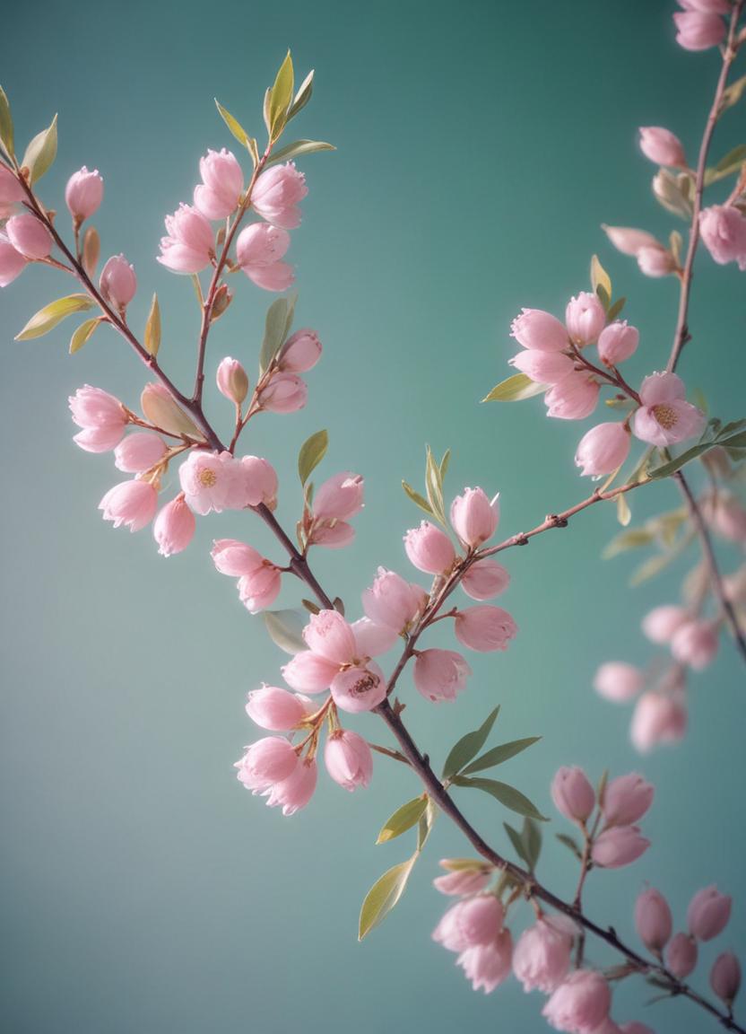 Soft pink flowers bloom on slender branches, creating a tranquil atmosphere with a calming green background. Nature's beauty is in full display.