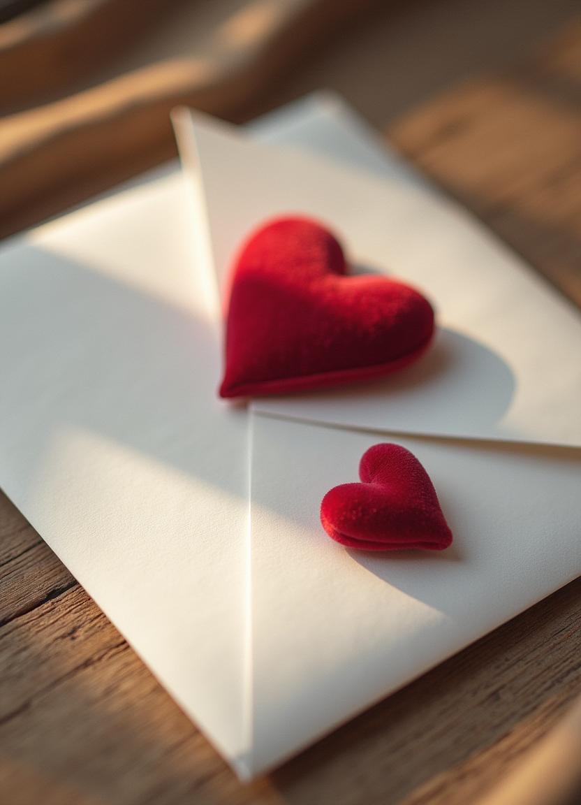 Two red velvet hearts rest on a white envelope, softly illuminated by warm sunlight in a cozy indoor setting.