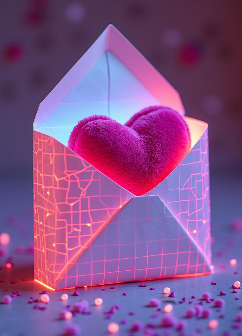 A vibrant heart-shaped cushion rests inside a stylish envelope, illuminated by colorful lights, creating a warm and inviting atmosphere.