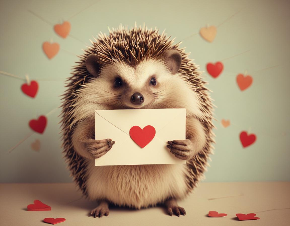 A hedgehog is gently holding a letter adorned with a heart, surrounded by scattered heart decorations in a warm environment.