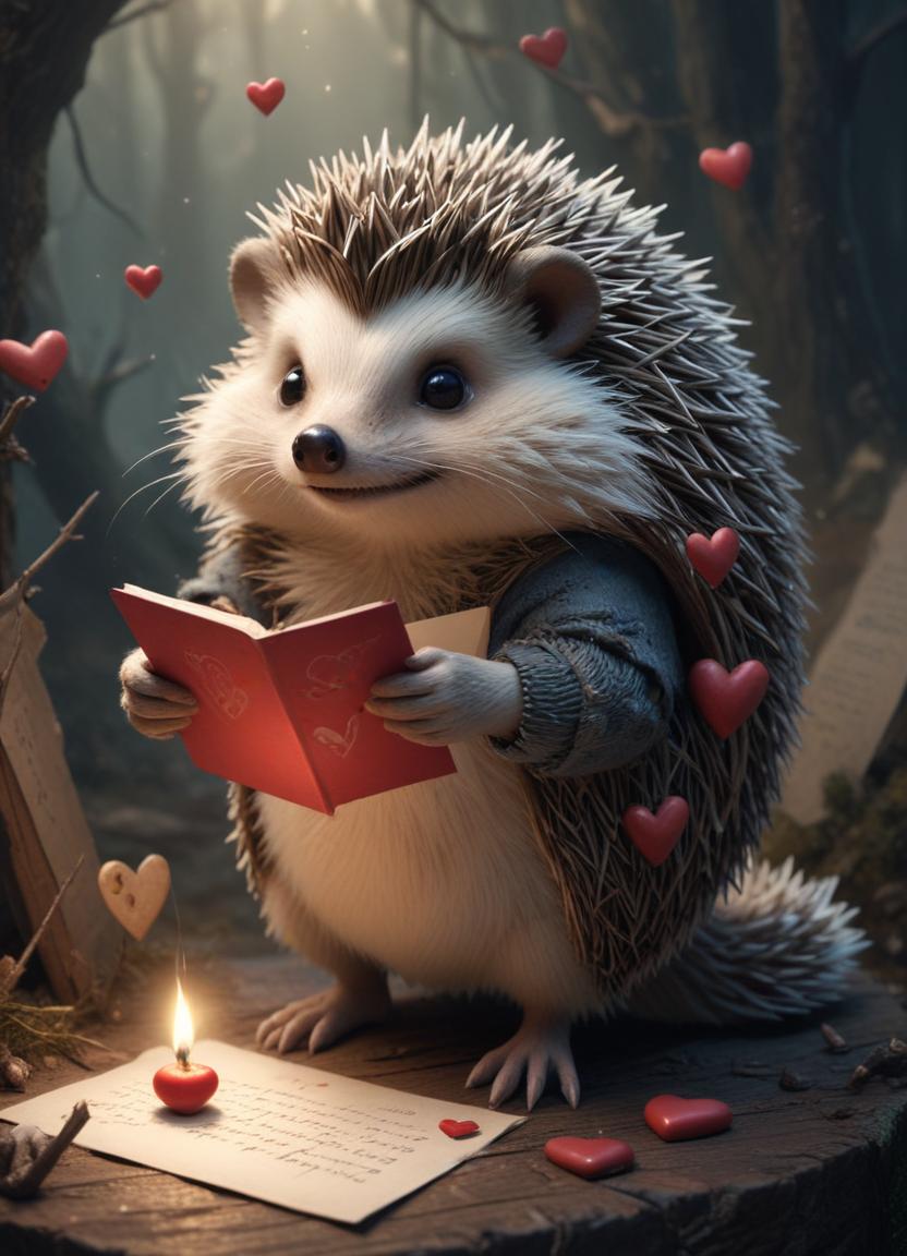 adorable, animal, art, candle, cozy, creature, cute, enchanting, forest, hearts, hedgehog, letter, love, magic, nature, night, reading, romance, whimsical, wildlife