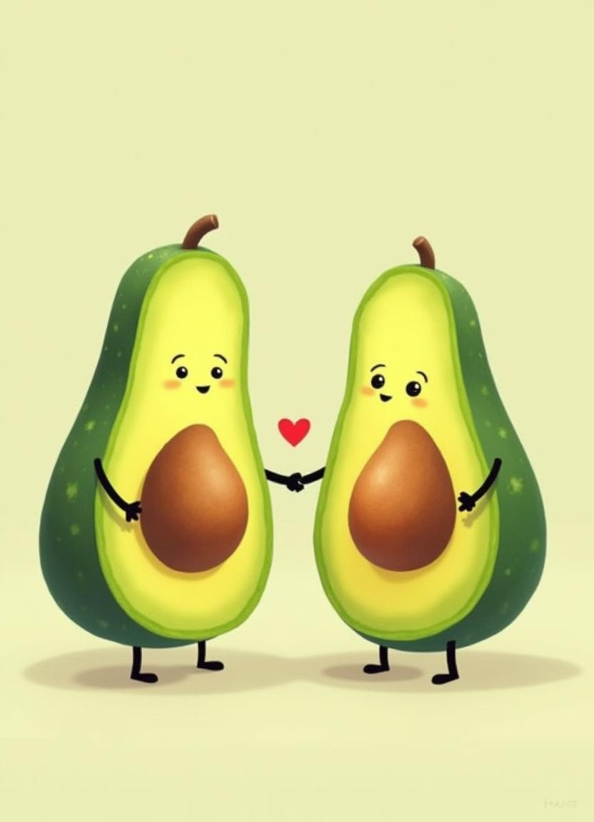 Two cheerful avocados stand together, holding hands with a heart between them. Their playful expression adds joy to the simple design.