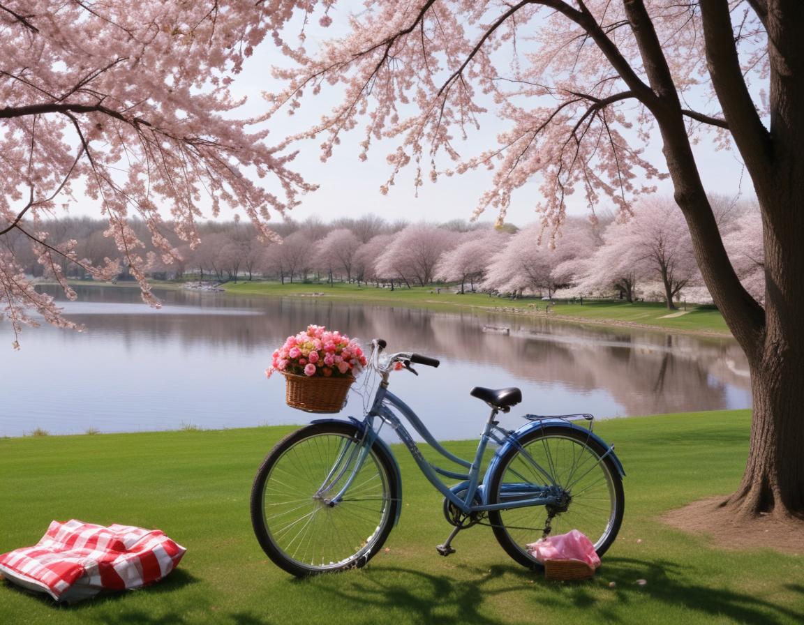 A blue bicycle with a basket of flowers rests near a serene lake. Pink cherry blossoms frame the view, creating a peaceful spring atmosphere.