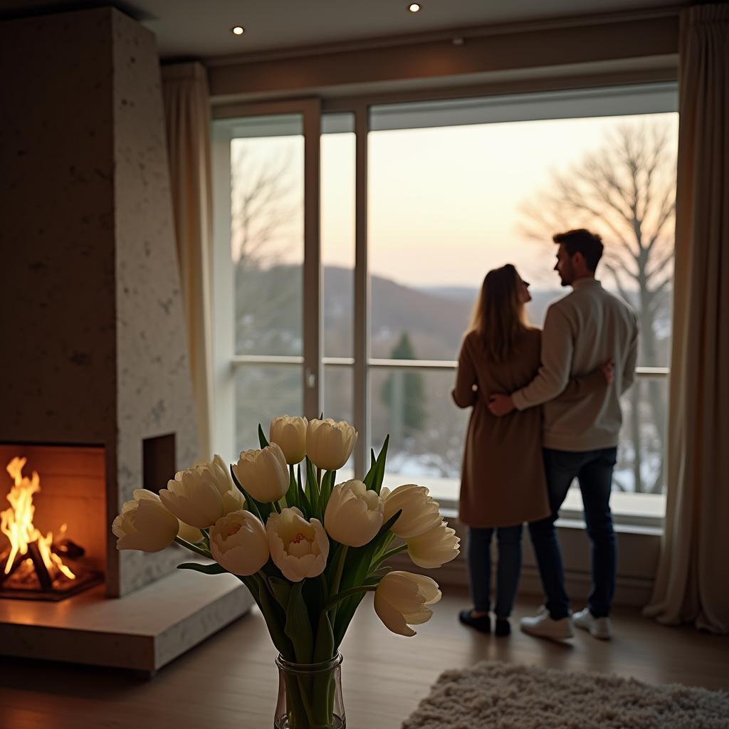 A couple stands by a window, embracing each other while admiring a sunset. A vase of tulips decorates the cozy room.